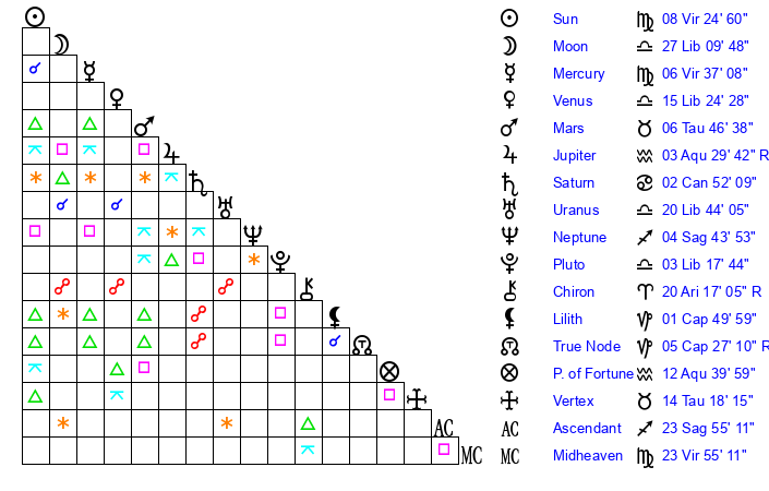 | Moon | 27 Libra 18 | 16 Sagittarius 54 | 21 Virgo 15 |