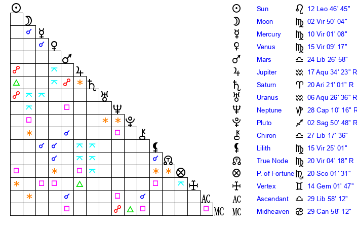 | Moon | 2 Virgo 48 | 23 Sagittarius 12 | 11 Virgo 35 |