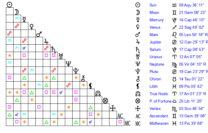 | Moon | 21 Gemini 10 | 22 Aquarius 53 | 12 Sagittarius 43 |