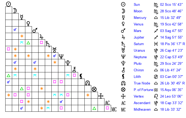 | Moon | 28 Scorpio 40 | 23 Sagittarius 39 | 7 Capricorn 24 |