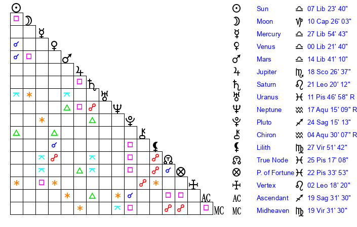 | Neptune | 17 Aquarius 15 | 0 Aries 32 | 17 Aquarius 4 |