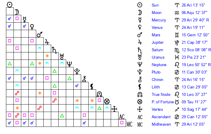 | Pluto | 11 Cancer 30 | 3 Aquarius 44 | 13 Cancer 34 |