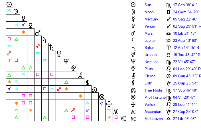| Sun | 17 Scorpio 12 | 18 Scorpio 7 | 15 Aquarius 34 |