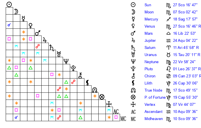 | Sun | 27 Scorpio 17 | 28 Scorpio 11 | 25 Aquarius 41 |