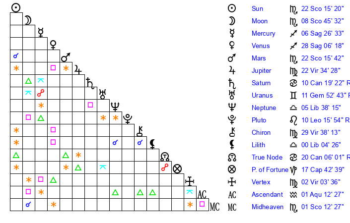 | Sun | 21 Scorpio 44 | 22 Scorpio 5 | 14 Aquarius 2 |