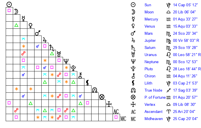 | Venus | 14 Aquarius 50 | 14 Capricorn 35 | 8 Taurus 21 |