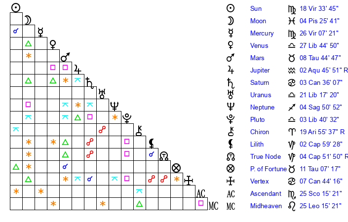 | Mercury | 25 Virgo 48 | 16 Virgo 48 | 26 Scorpio 0 |