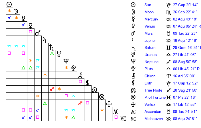| Neptune | 8 Sagittarius 49 | 27 Pisces 35 | 9 Sagittarius 36 |