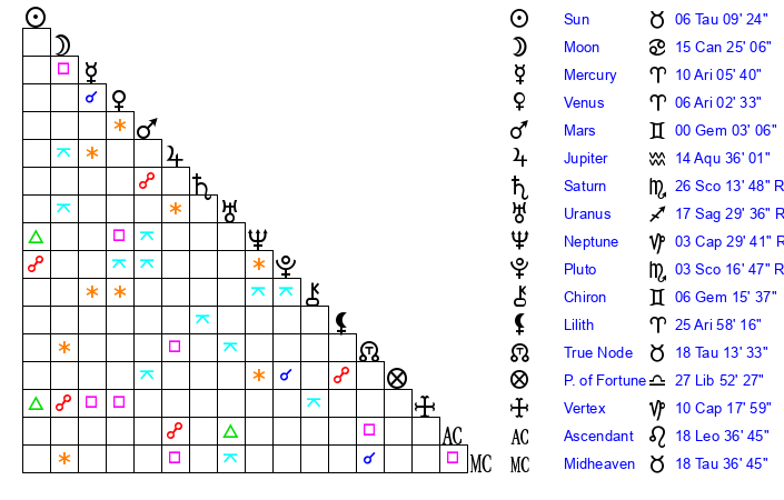 | Uranus | 17 Sagittarius 31 | 26 Taurus 4 | 16 Sagittarius 4 |