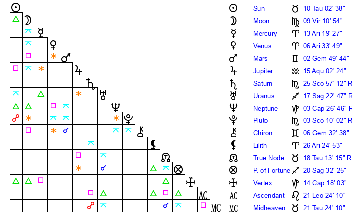 | Jupiter | 14 Aquarius 59 | 21 Gemini 13 | 16 Aquarius 54 |