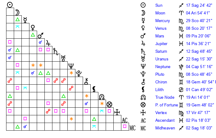 | Saturn | 12 Sagittarius 57 | 25 Pisces 10 | 17 Sagittarius 18 |