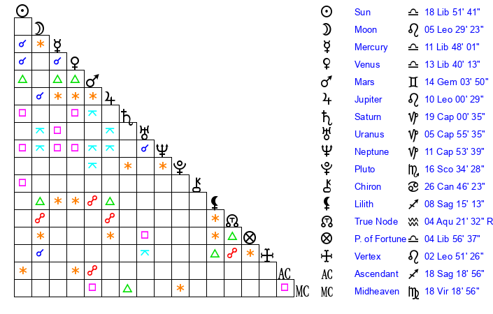 | Moon | 2 Leo 50 | 29 Gemini 46 | 11 Scorpio 26 |