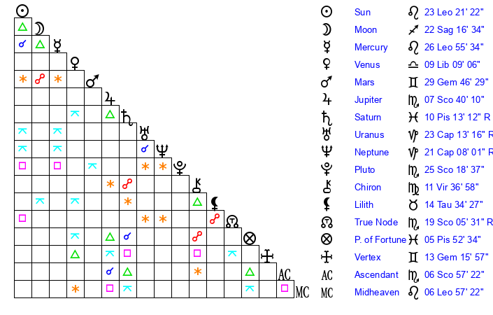 | Moon | 19 Sagittarius 37 | 24 Taurus 16 | 10 Aquarius 53 |