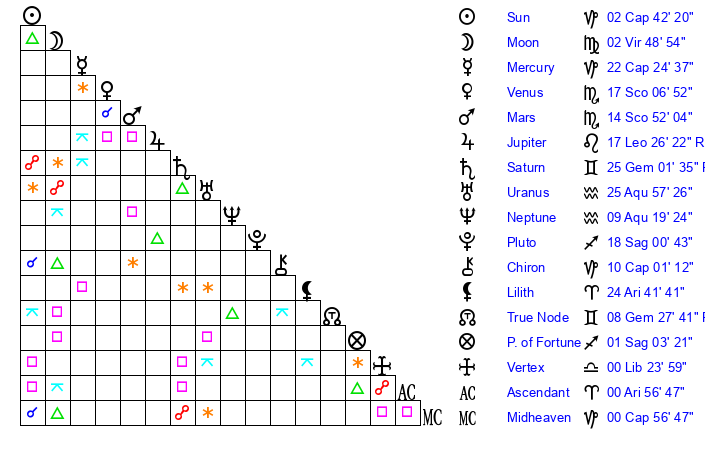 | Mercury | 21 Capricorn 54 | 17 Sagittarius 3 | 15 Capricorn 43 |