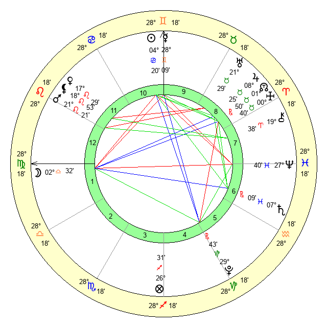 | Moon | 3 Libra 43 | 16 Cancer 7 | 28 Libra 36 |