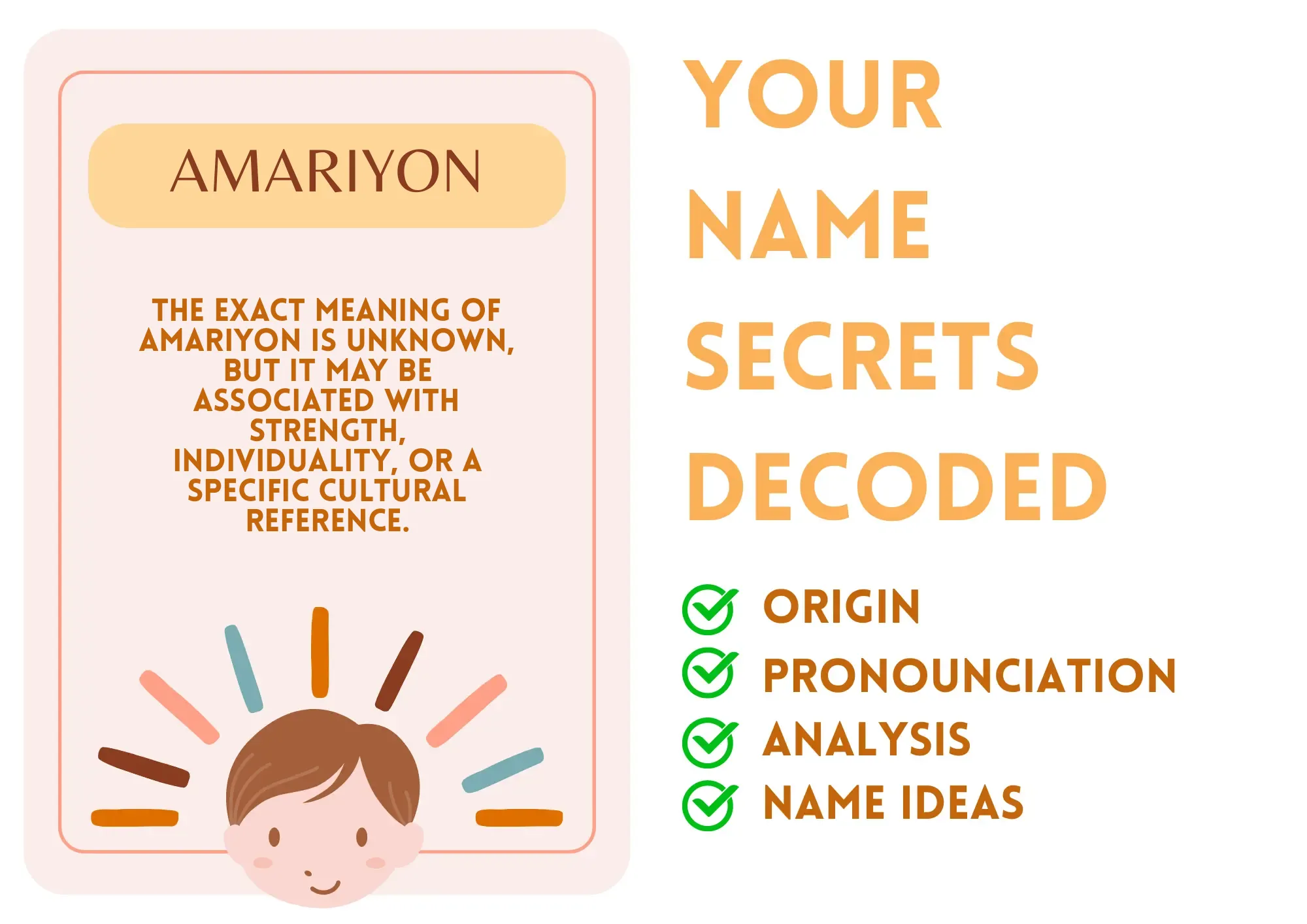 Amariyon is a modern and unique name with a melodic sound. While its origin and meaning are not widely documented, it likely carries a sense of strength and individuality. Its modern feel makes it a distinctive choice for parents seeking a name that stands out.