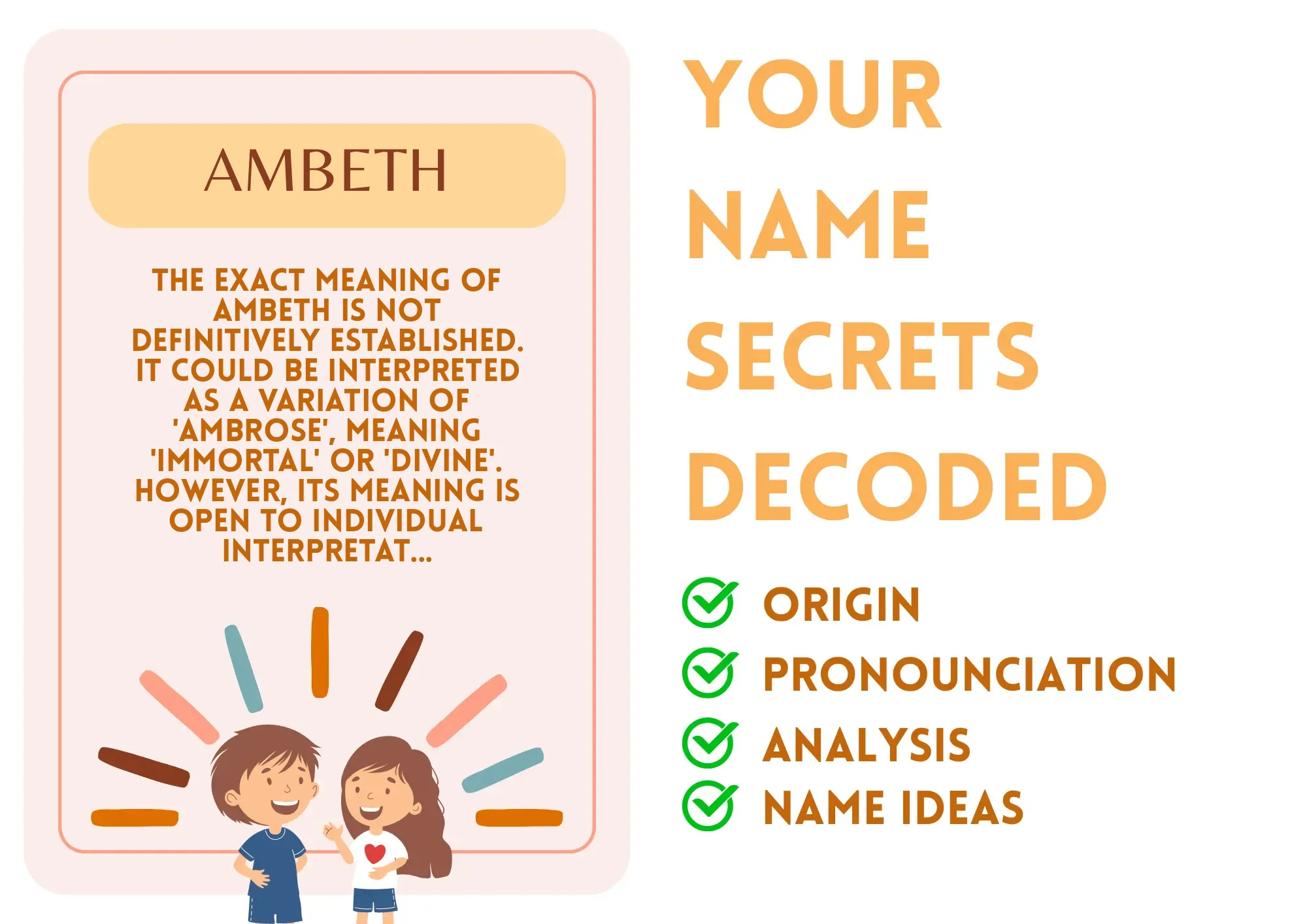 Imagine walking into a room and instantly turning heads—not with flashy clothes, but with a name that feels like a sprinkle of magic in the air. Ambeth does just that! This name, unique and captivating, is like the special seasoning in an otherwise familiar dish, sparking curiosity and inviting people to learn more about you. With Ambeth, you’re not just another face in the crowd; you’re a conversation starter, a spark of individuality amidst the ordinary.