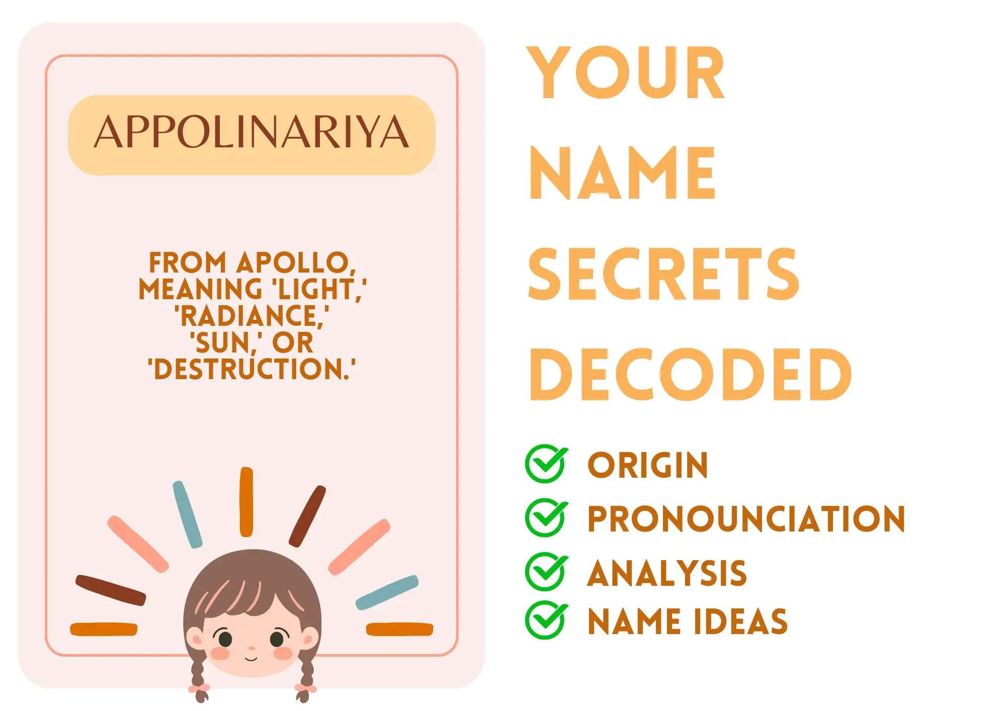 Picture a name that holds the intensity of the sun and the elegance of music — that’s Appolinariya for you! With a name like this, filled with uniqueness and charm, you can just imagine the personality that lies behind it. It’s like stepping into a vibrant scene painted in rich, bold colors where each brush stroke tells its own story, and you can feel the warmth as well as the imaginative energy. This name is a canvas for expressive creativity and a beacon for those around her!