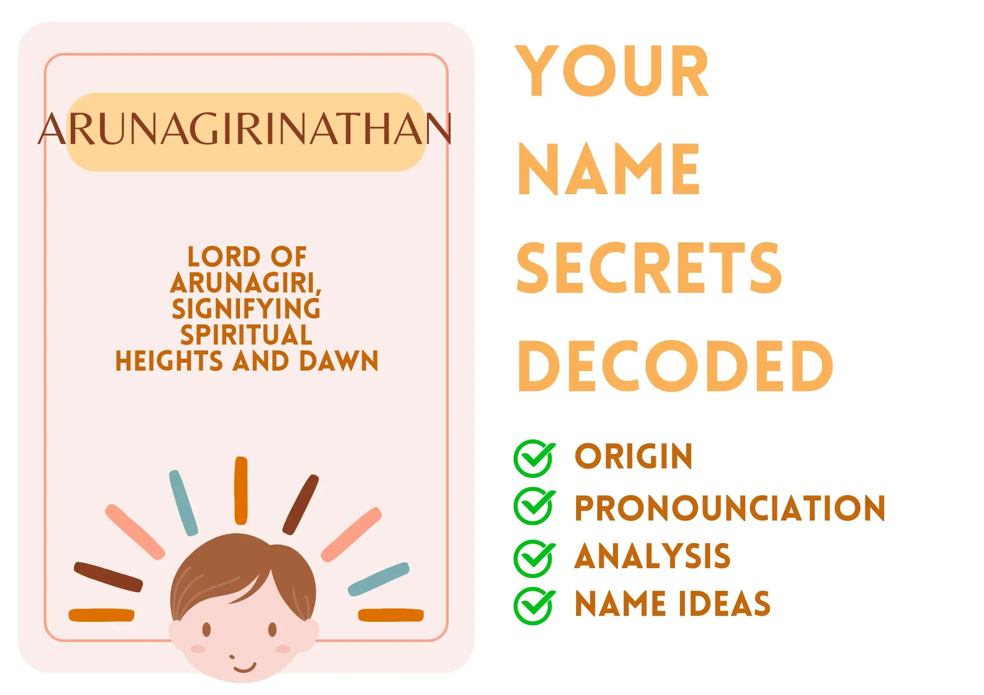 Arunagirinathan is a noble and majestic name of classical Tamil origin, meaning 'Lord Arunagiri', where 'Aruna' refers to 'sunrise' or 'redness', and 'Girinathan' signifies 'Lord of the mountain'. It carries a significant spiritual and cultural lineage, often used among Tamil-speaking Hindus. The name is profoundly linked to the revered poet-saint Arunagirinathar, celebrated for his 'Tiruppugazh' hymns. Viewed as a name of reverence and spiritual depth, it is cherished in Tamil culture for its deep historical and philosophical associations, making it a respected choice among devout families.