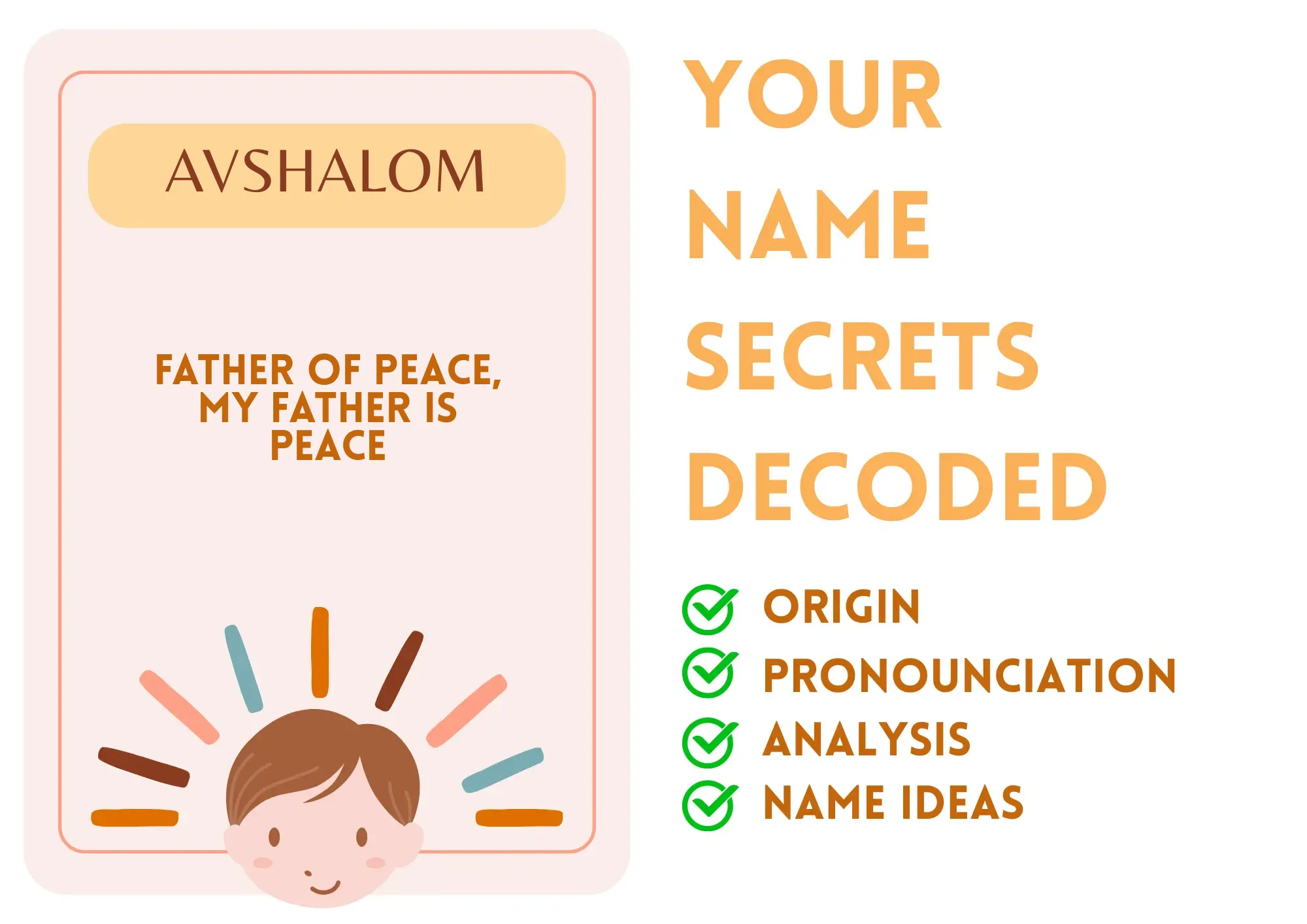 Avshalom is a name steeped in history and biblical significance, evoking both strength and tragedy. Of Hebrew origin, it translates to 'father of peace' or 'my father is peace,' hinting at a desire for tranquility and harmony. The name is primarily used for boys and holds a powerful presence in Jewish culture, particularly due to its association with the biblical figure of Absalom.