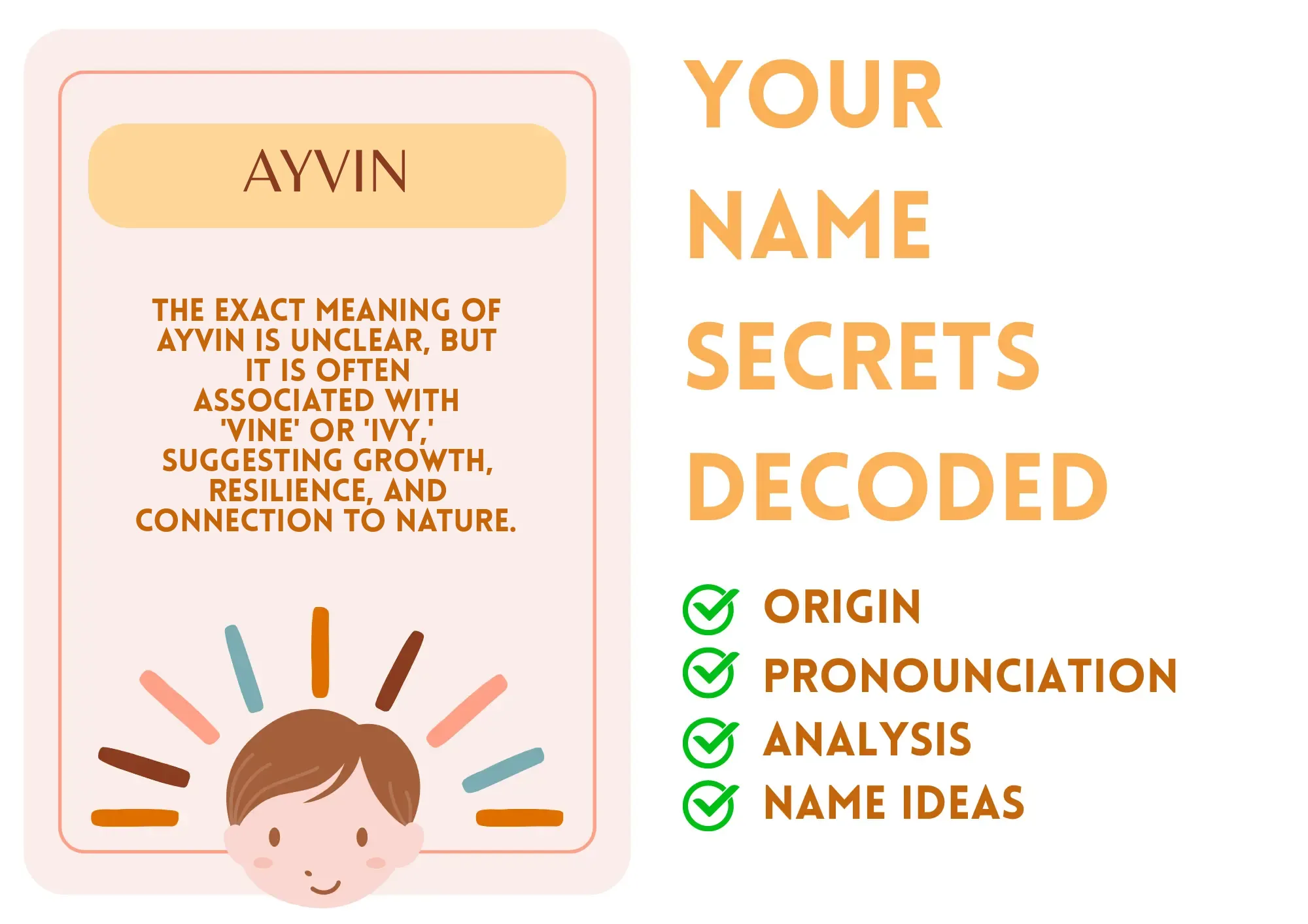 Ayvin is a modern and unique name with a blend of nature-inspired and strong connotations. Its origins are unclear, but it is often associated with the natural world, particularly the concept of 'vine' or 'ivy,' suggesting growth, resilience, and connection to nature. While its meaning is open to interpretation, it evokes a sense of strength, individuality, and a connection to something bigger than oneself.