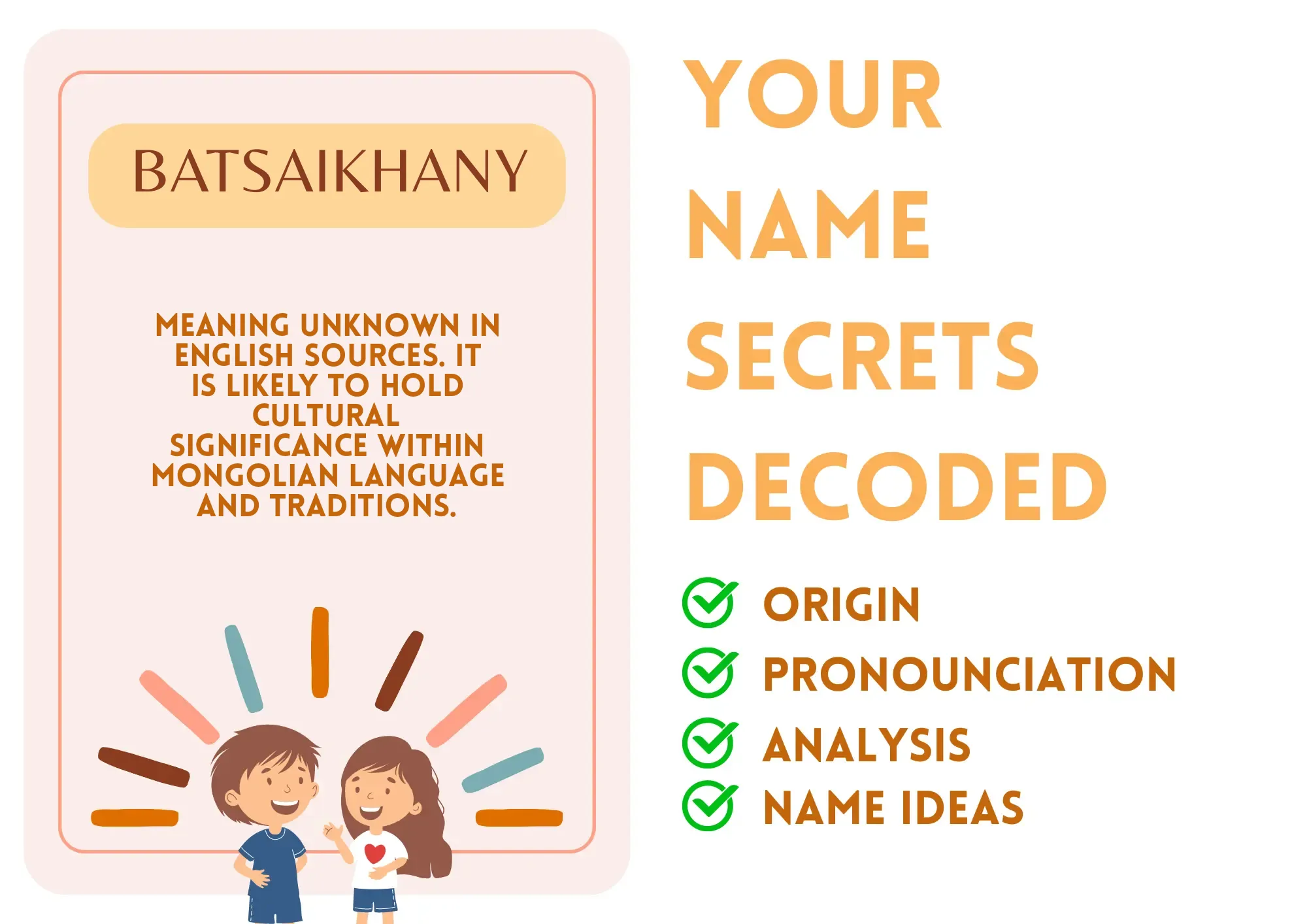 With a name like Batsaikhany, you will naturally carry a treasure trove of cultural significance and history. It’s like having a colorful map in your pocket, leading you to deep-rooted traditions and meanings yet to be uncovered. You possess an innate curiosity and respect for diverse cultures, often drawing in friends and peers with your rich stories about your heritage. Your name helps you connect with others on meaningful levels, showcasing how rich and diverse people’s backgrounds can inspire us to learn more about each other. Exploring your own background can help you understand yourself better and see the value in your unique perspective.