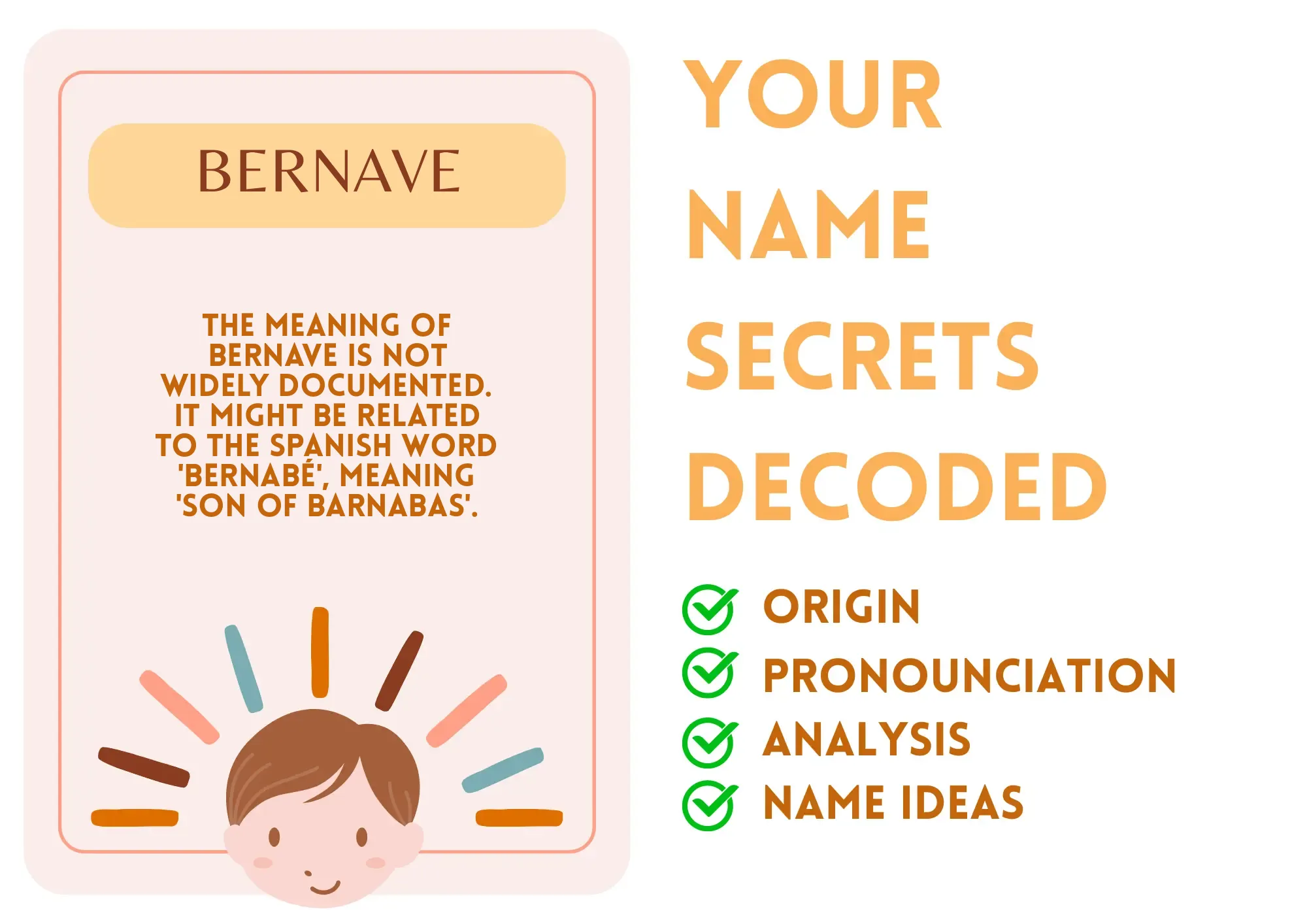 Meaning: The meaning of Bernave is not widely documented. It might be related to the Spanish word 'bernabé', meaning 'son of Barnabas'.