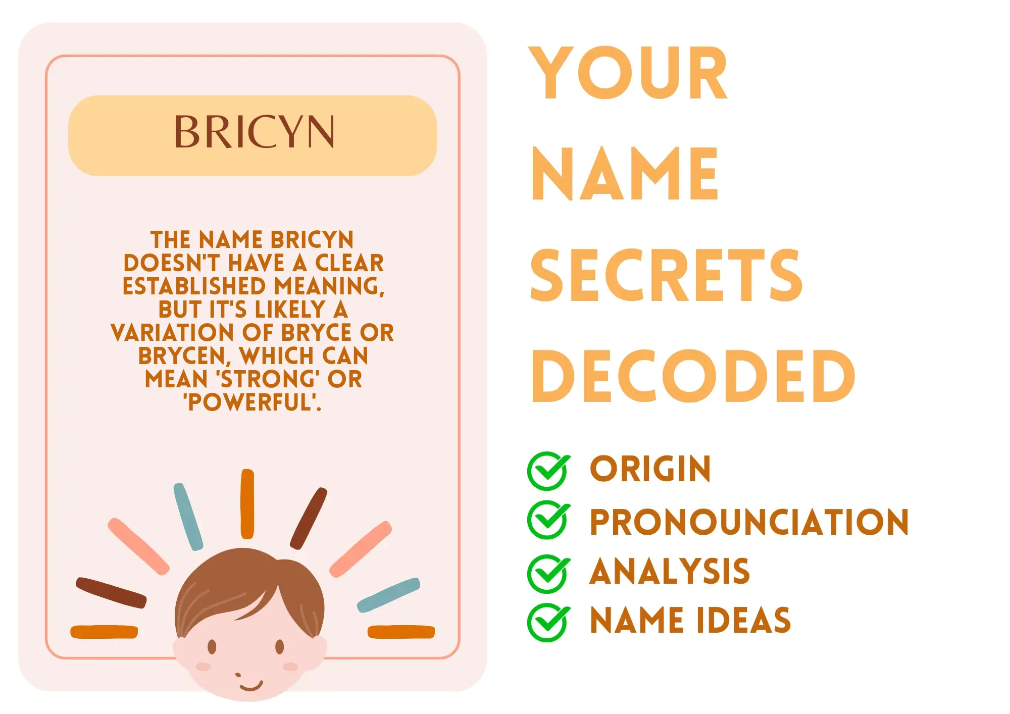 Meaning: The name Bricyn doesn't have a clear established meaning, but it's likely a variation of Bryce or Brycen, which can mean 'strong' or 'powerful'.