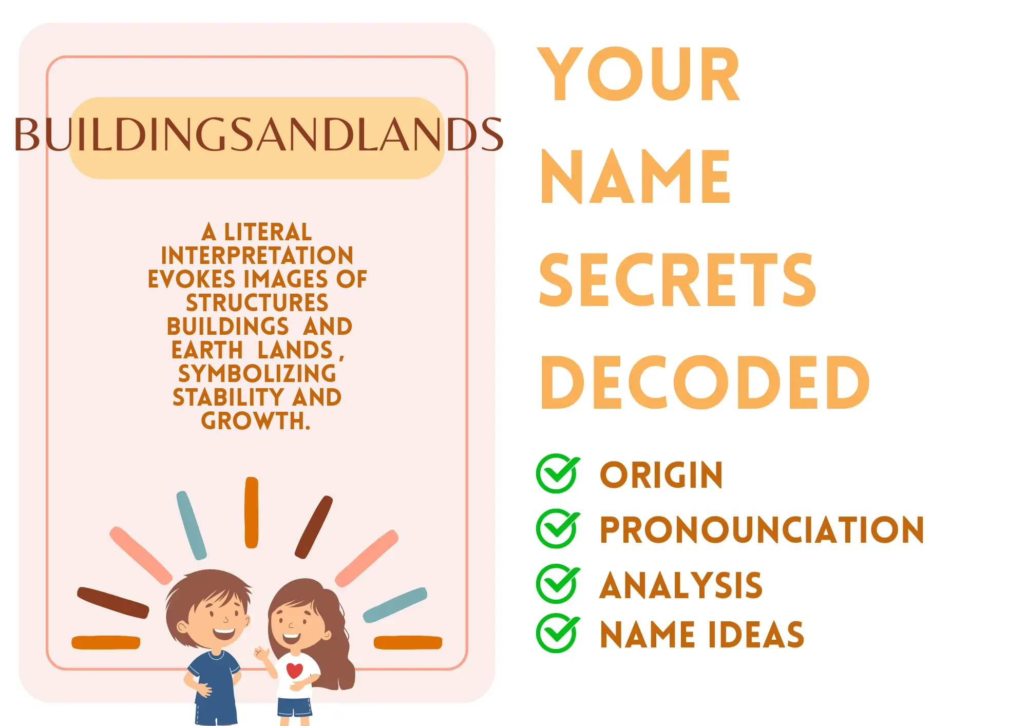 Origin: The name Buildingsandlands is a constructed phrase in English, stemming from the words 'buildings' and 'lands' that emphasize physical spaces and environments.