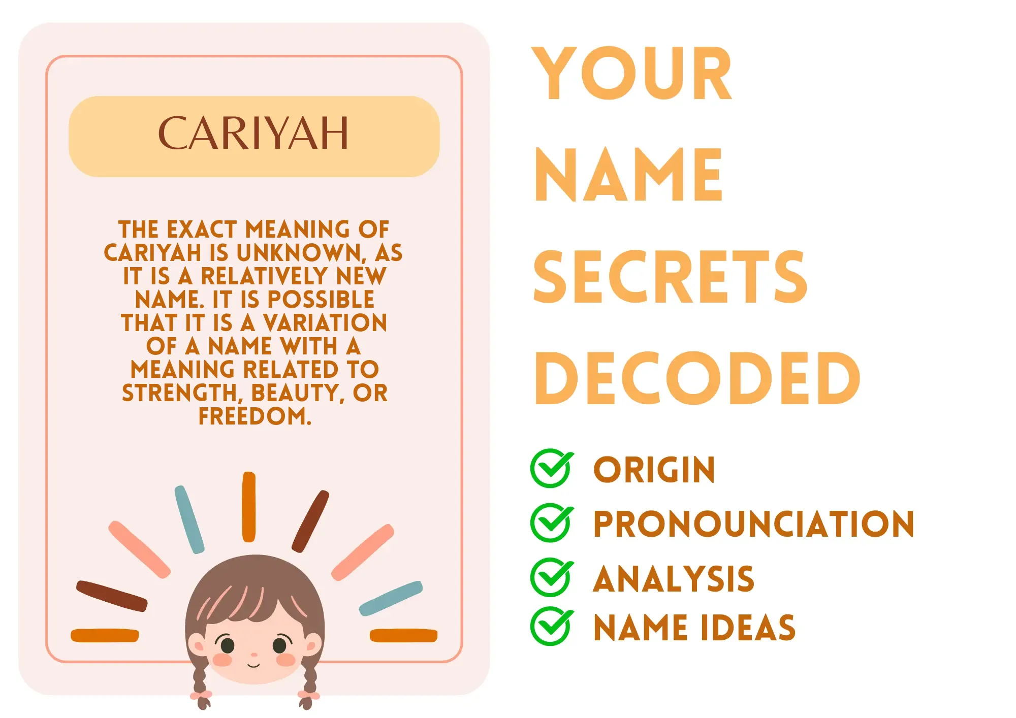 Meaning: The exact meaning of Cariyah is unknown, as it is a relatively new name. It is possible that it is a variation of a name with a meaning related to strength, beauty, or freedom.