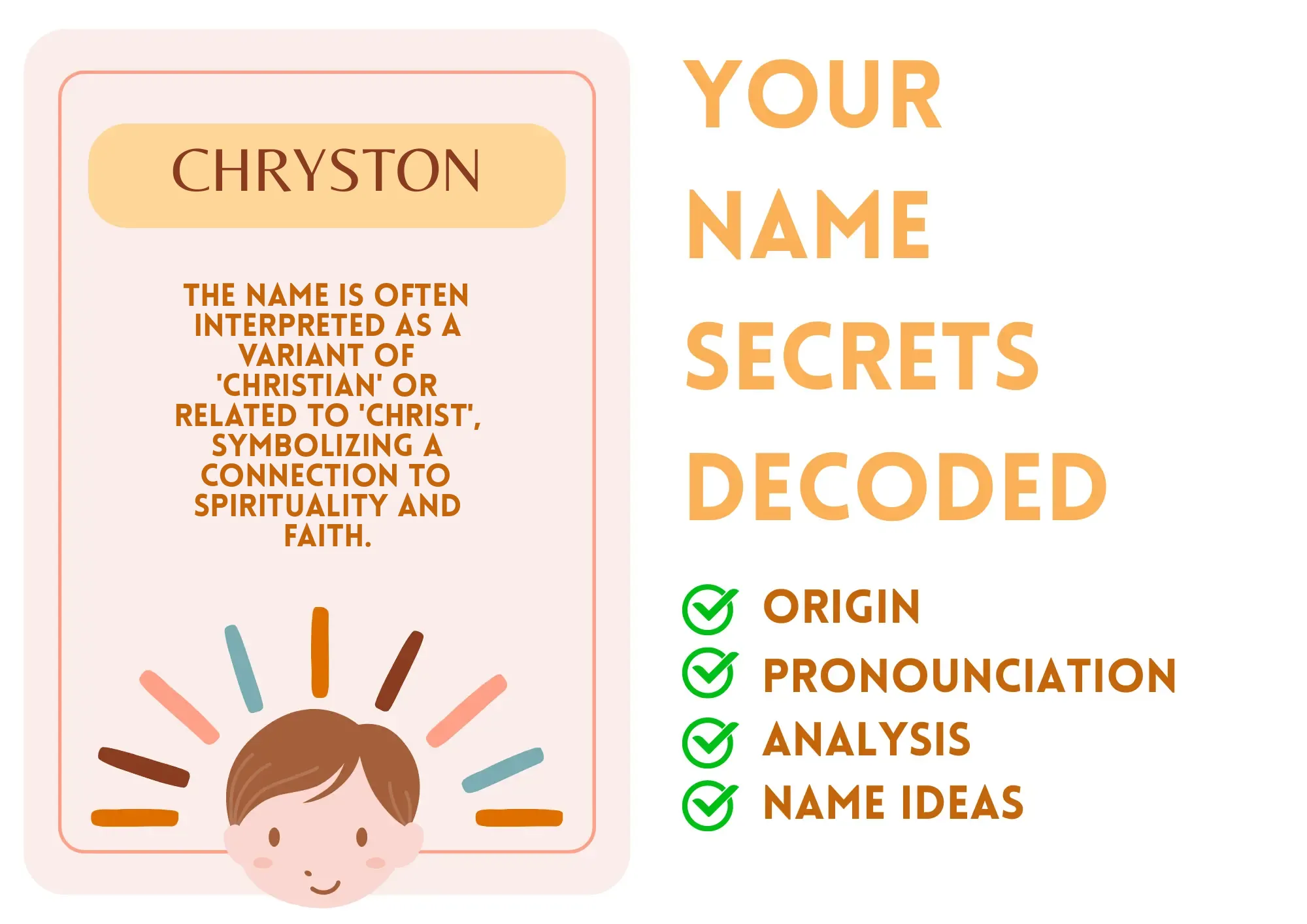 Origin: The name Chryston is an Anglicized variant drawing from the Greek word 'Christos', which means 'the anointed one'. Its roots can be traced through historical adaptations of the name 'Christian'.