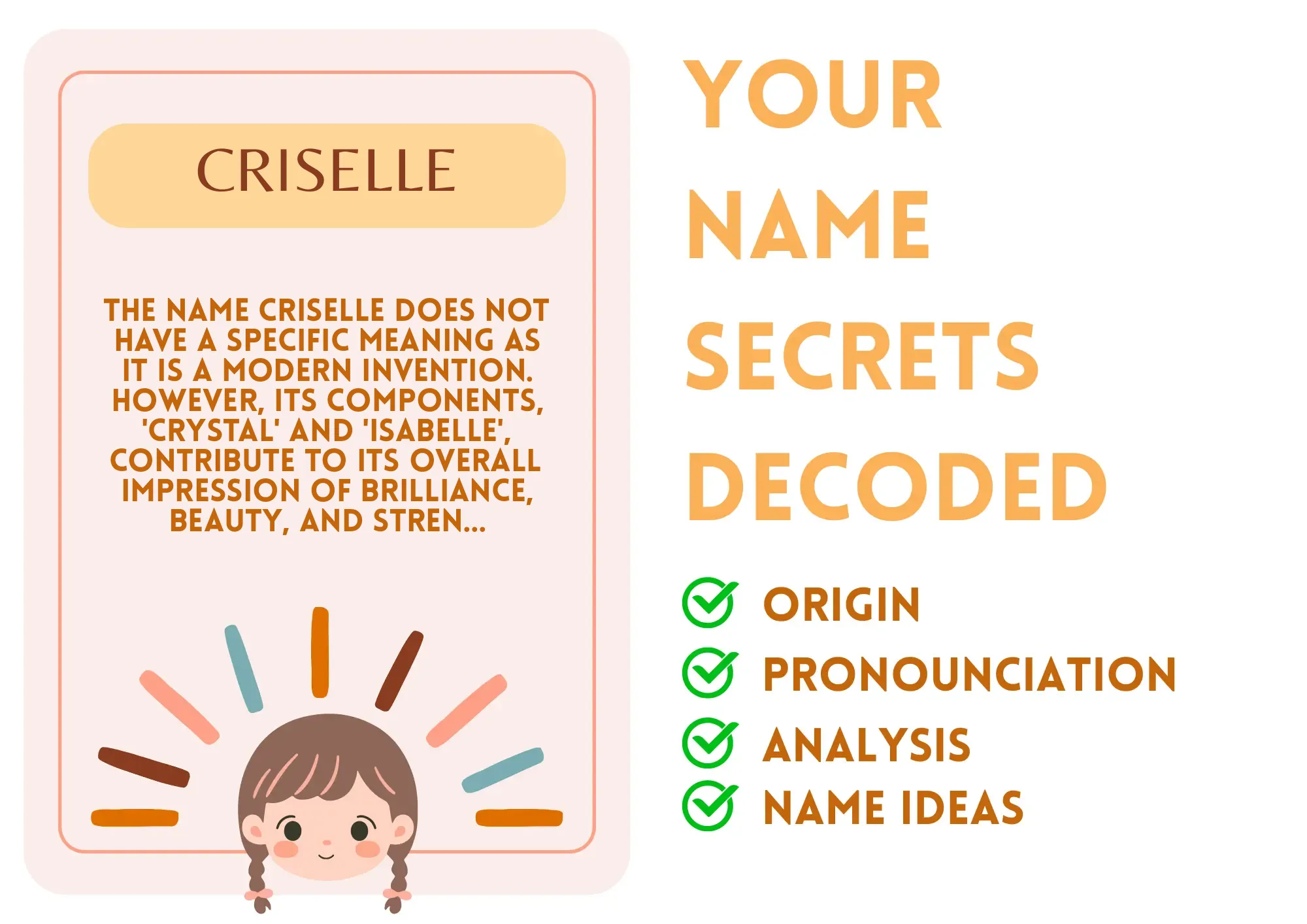 Criselle is a name that is sure to make a lasting impression, reflecting a confident and independent spirit. Its unique charm and elegant sound make it a perfect choice for parents seeking a distinctive and meaningful name for their daughter.