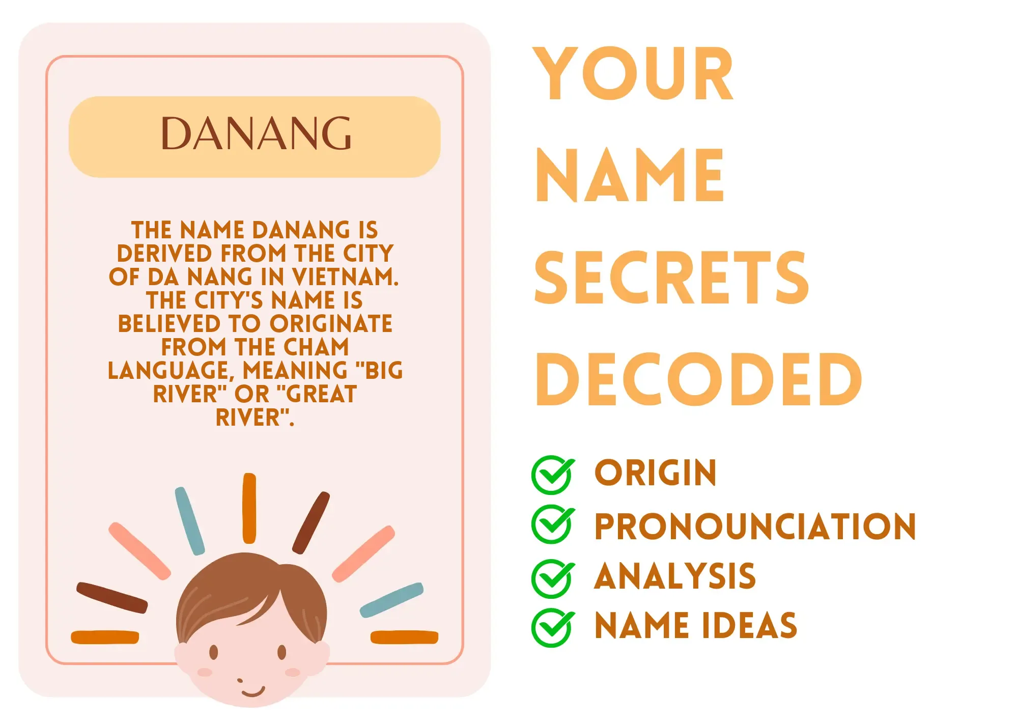 Meaning: The name Danang is derived from the city of Da Nang in Vietnam. The city's name is believed to originate from the Cham language, meaning "Big River" or "Great River".