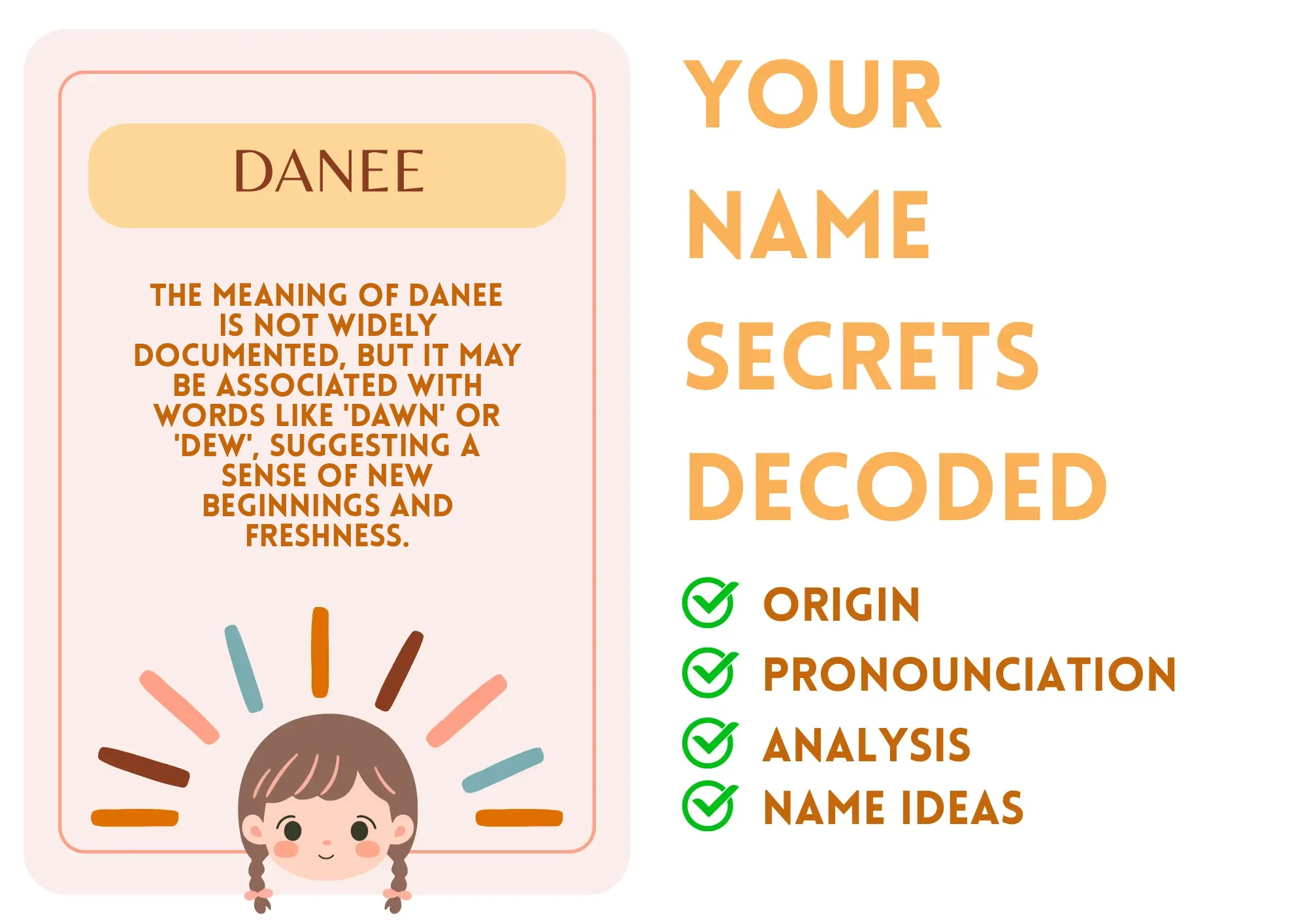 Danee, a name that might remind you of 'dawn' or 'dew', signifies a radiant freshness in her personality. Just as dawn breaks to usher in a new day, Danee has a talent for embracing change and opportunities. For example, if she finds herself in a new school or a fresh environment, her enthusiasm lights the way for herself and others. Her presence is like a cool morning breeze that invites everyone to begin anew, encouraging them to leave behind any remnants of yesterday.
