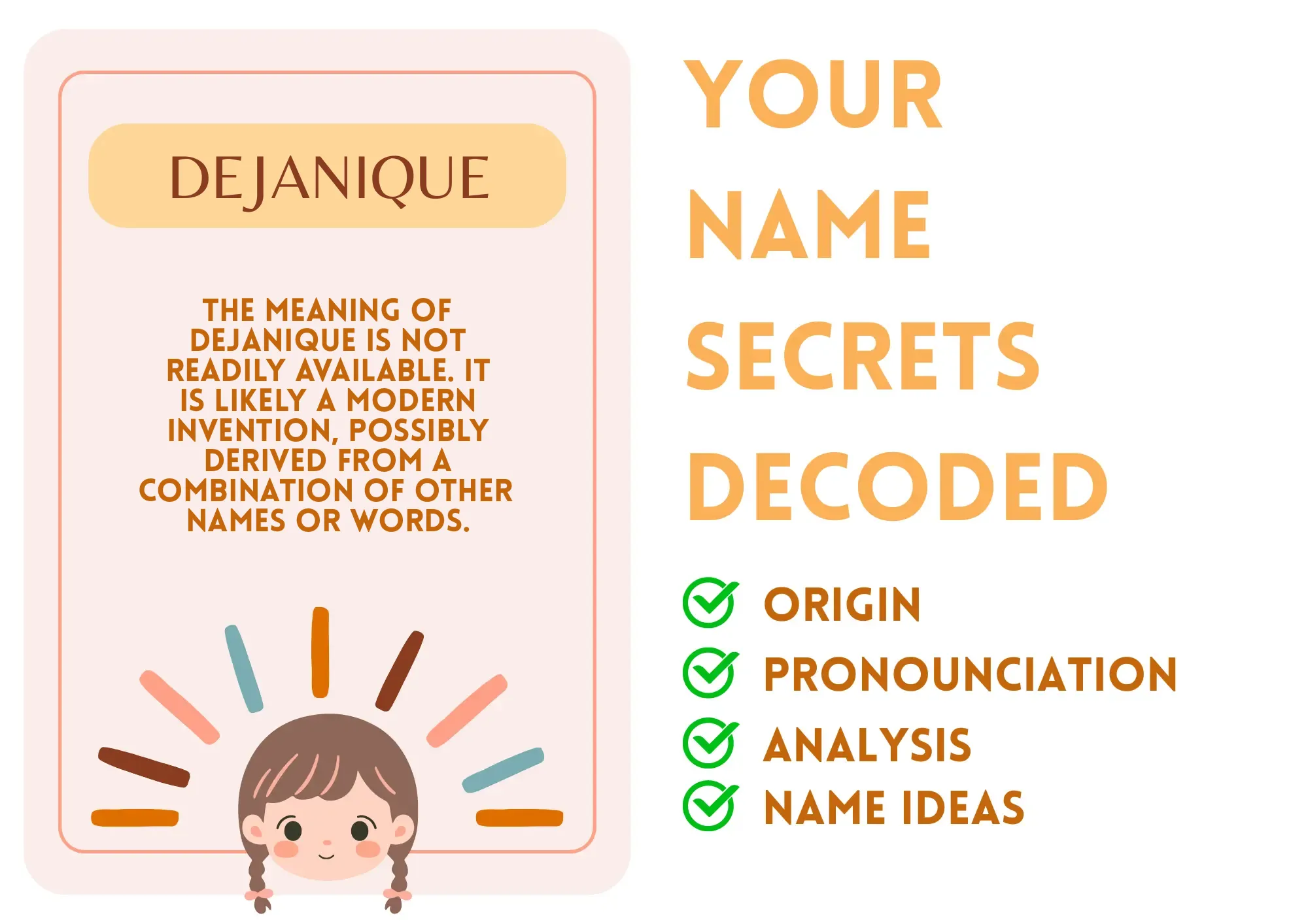 Dejanique is a unique and modern name with a strong, distinctive sound. It is primarily used for girls and has a sense of individuality and strength. While its meaning is not readily available, the name itself evokes a sense of beauty, confidence, and sophistication.
