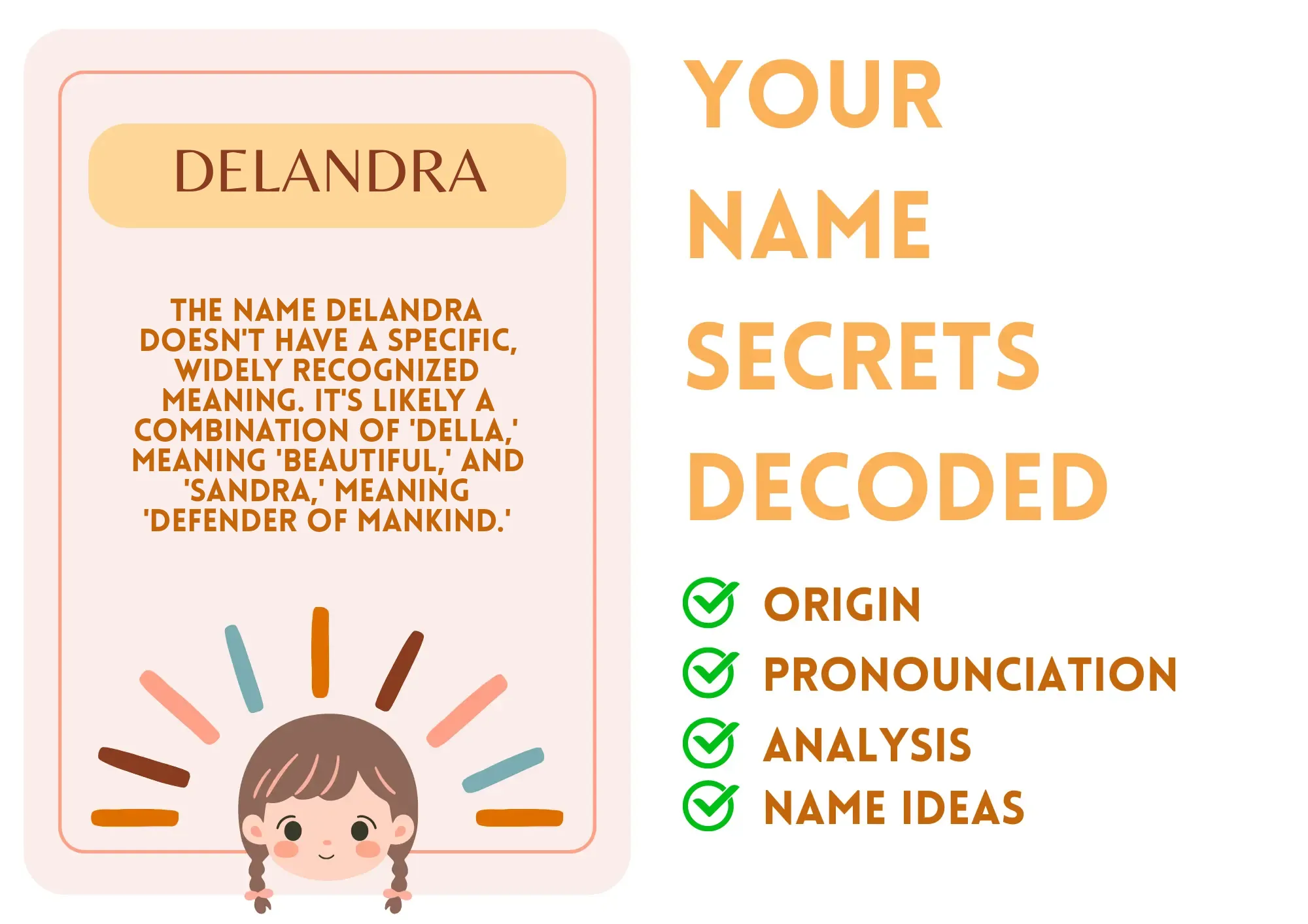 The name combines 'Della,' meaning 'beautiful,' with 'Sandra,' meaning 'defender of mankind.' This is brilliant because it suggests that Delandra carries a beauty that sparks joy in others while also standing up for what is right. Imagine a superhero with grace - always ready to lend a hand or fight injustice! For Delandra, this plays out in her life as she is often the first to volunteer for causes or stand up for her friends when they need support. It’s like she wears an invisible cape, defending those who can’t defend themselves and transforming the ordinary into the extraordinary.