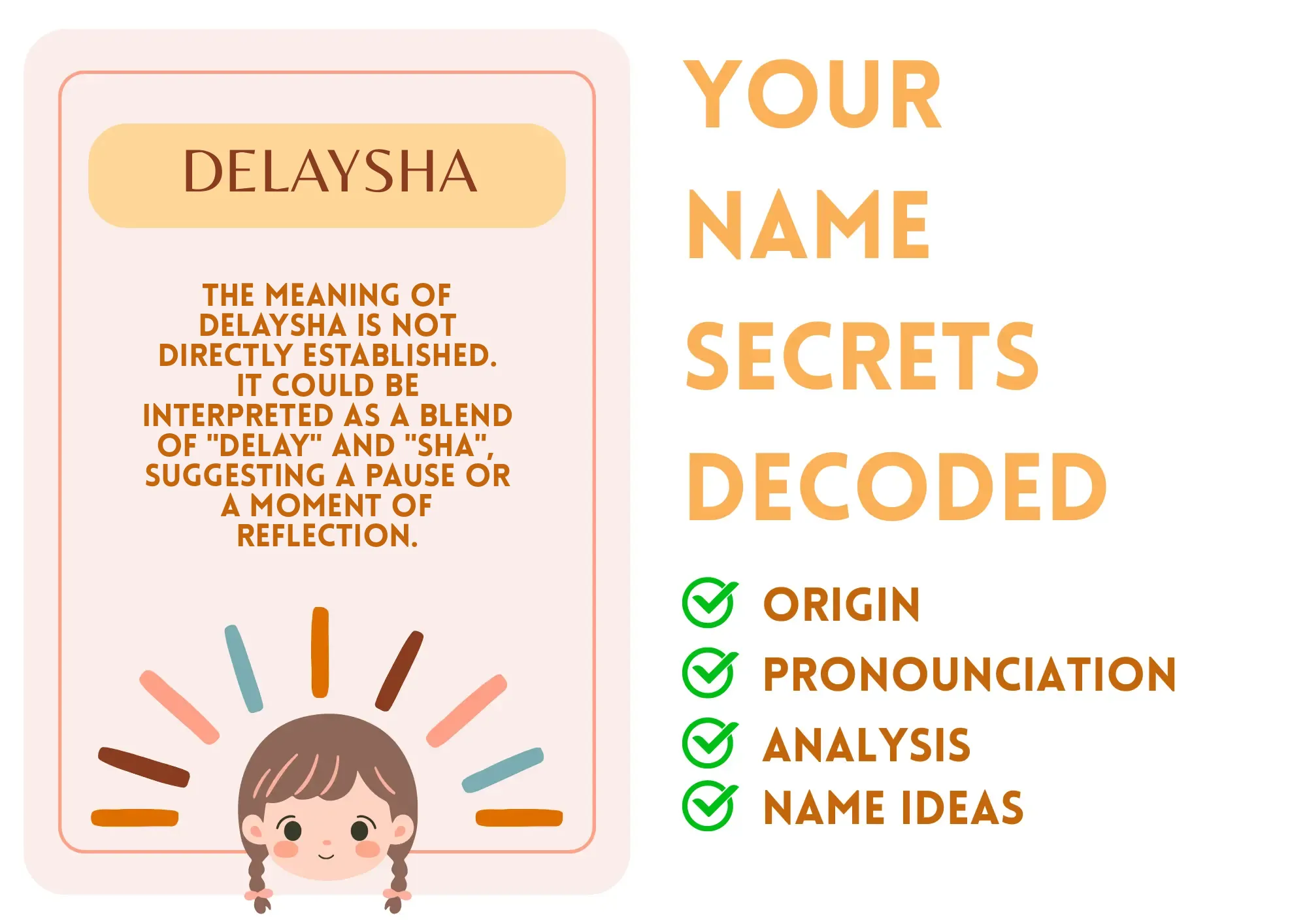 Delaysha is a unique and modern name with a strong, sophisticated sound. While its meaning is not directly established, it can be interpreted as a blend of "delay" and "sha" (a common suffix in some cultures), potentially suggesting a pause or a moment of reflection before taking action. The name is likely of American origin, reflecting the contemporary trend of creating distinctive names.