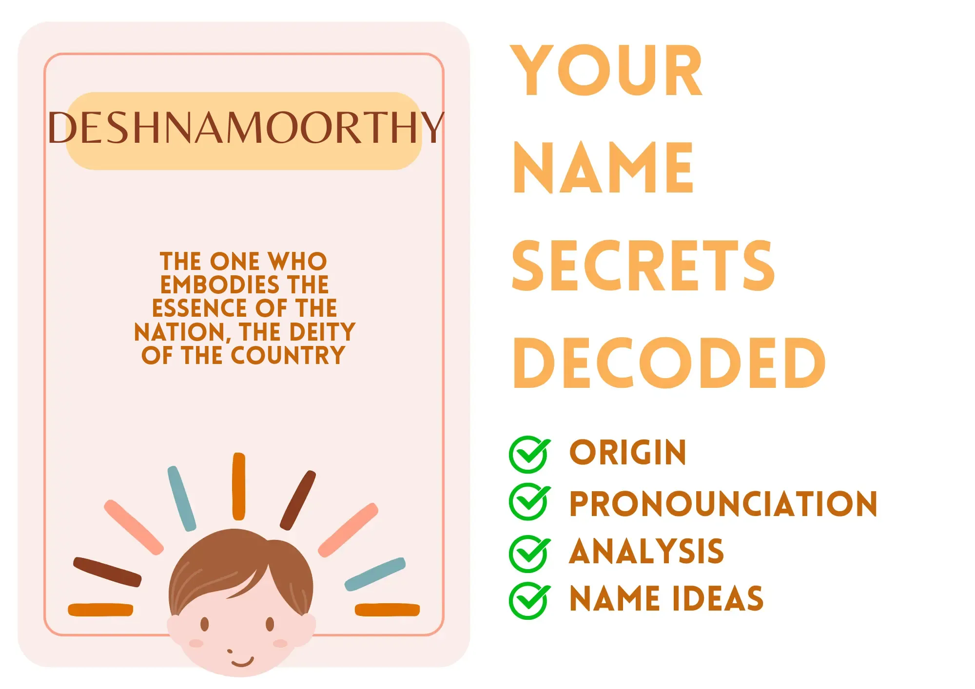 Usage: Deshnamoorthy is traditionally a masculine name linked to a sense of national identity and pride.