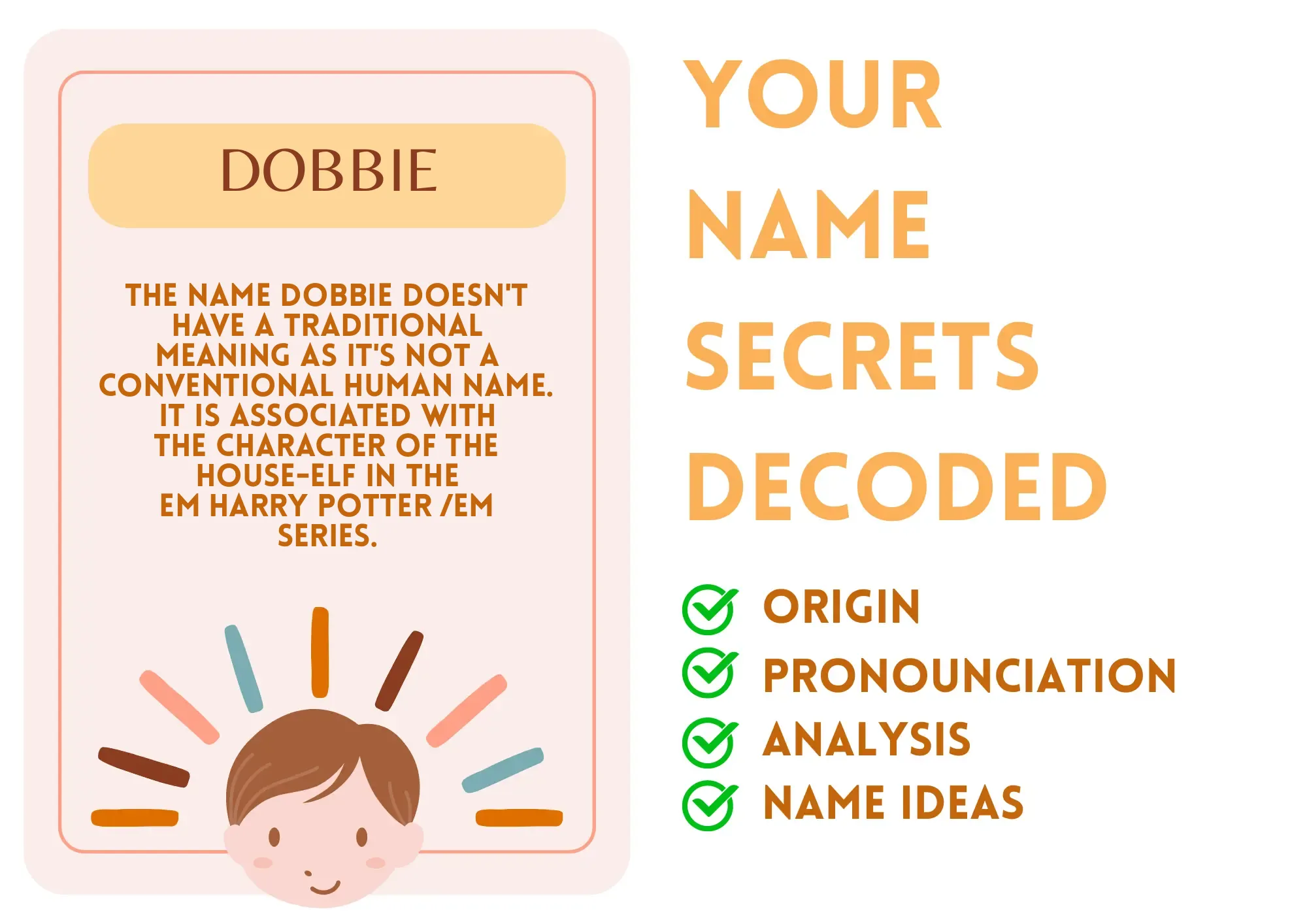 Meaning: The name Dobbie doesn't have a traditional meaning as it's not a conventional human name. It is associated with the character of the house-elf in the <em>Harry Potter</em> series.