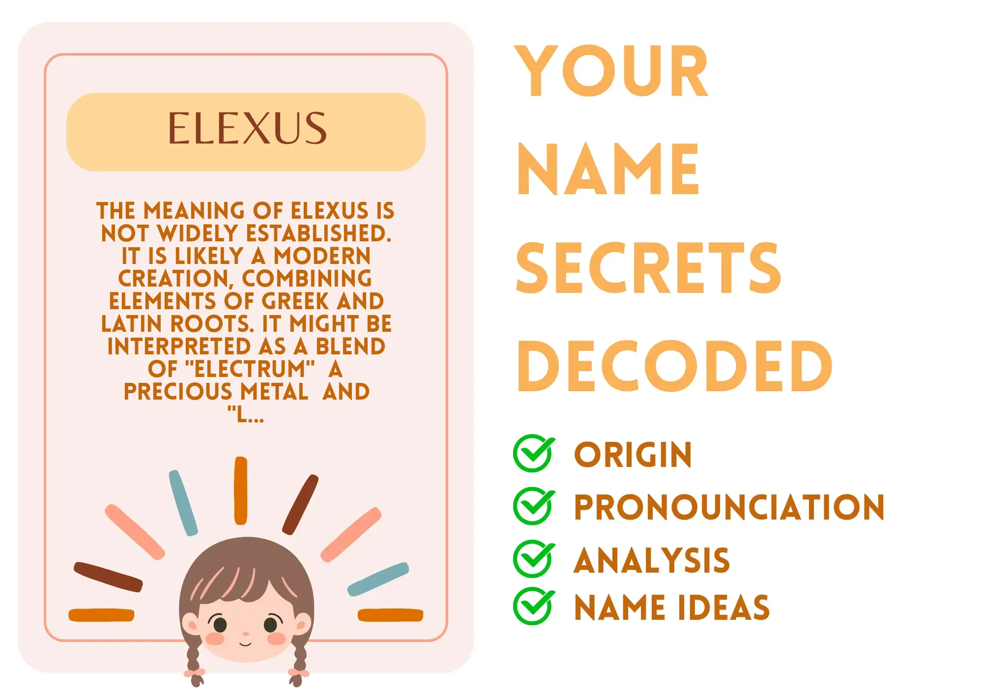 Meaning: The meaning of Elexus is not widely established. It is likely a modern creation, combining elements of Greek and Latin roots. It might be interpreted as a blend of "electrum" (a precious metal) and "lux" (light), suggesting beauty, brilliance, and protection.