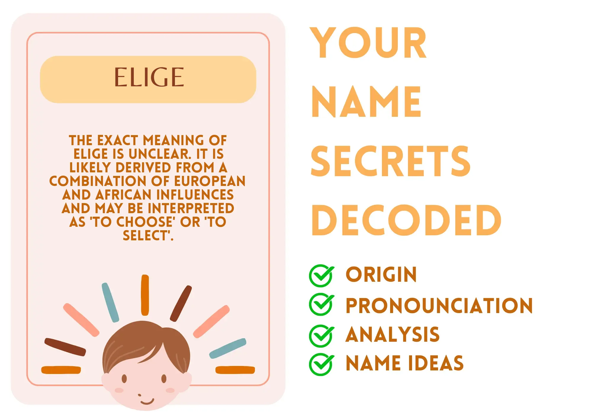 Elige is a unique and uncommon name with a strong and elegant sound. Its origin is likely from a combination of European and African influences, drawing inspiration from nature and strength. While the meaning is not widely documented, it could be interpreted as 'to choose' or 'to select', reflecting a sense of purpose and decision-making.