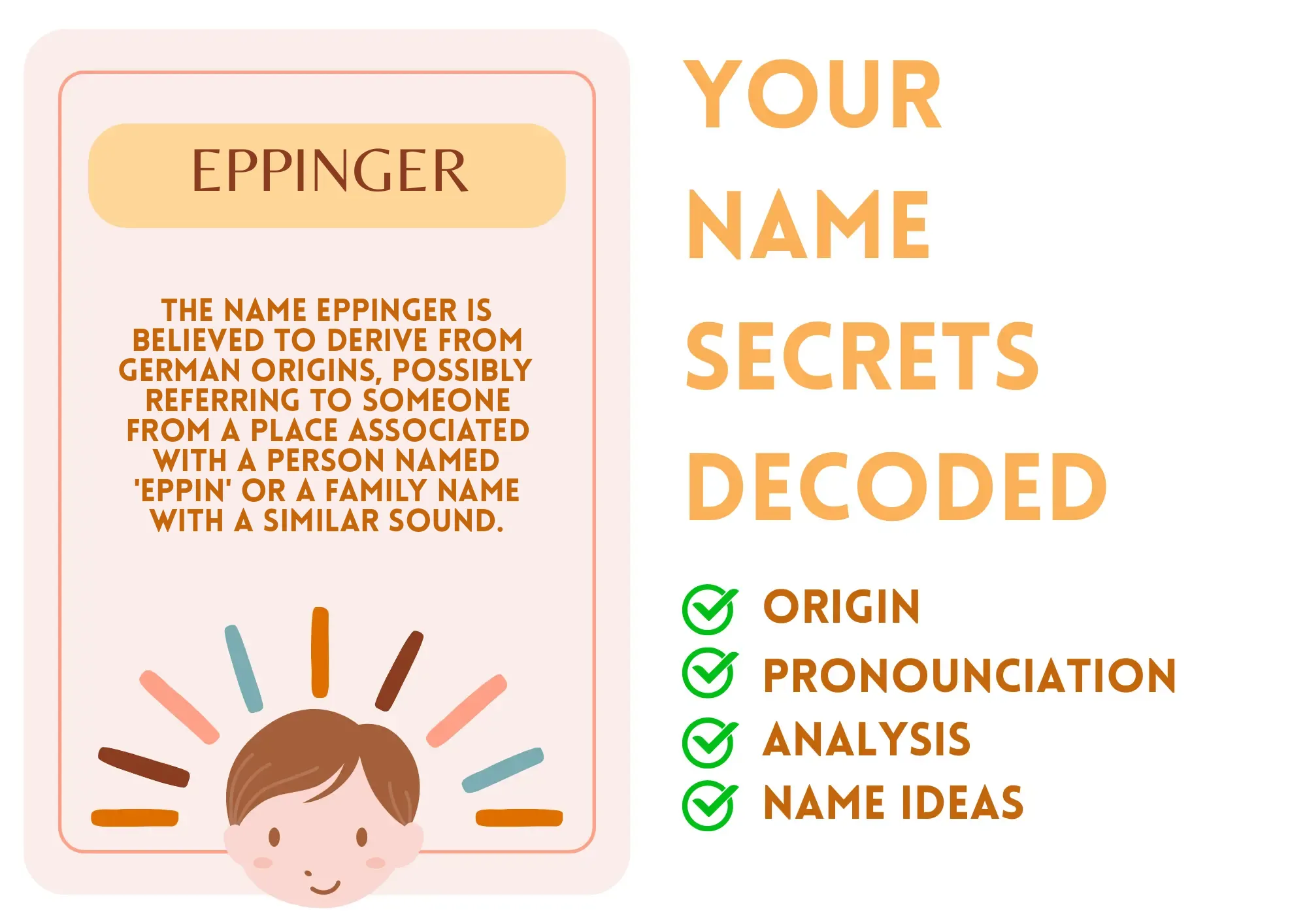 Eppinger is a unique and seldom-used name that has a distinct sound and character. It may suggest a heritage rich in culture and tradition, as names like Eppinger are often derived from surnames that can reflect geographic or familial origins. The name can carry connotations of strength and an independent spirit.