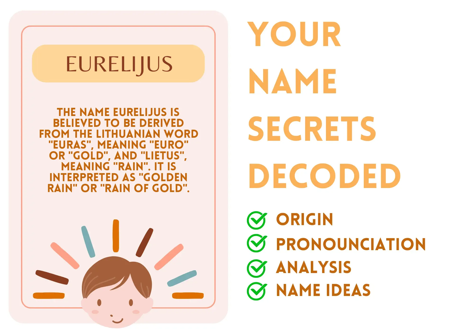 Imagine the meaning behind Eurelijus as if it's a refreshing spring rain, falling softly yet leaving a trail of golden leaves. The name brings together "euras," meaning "euro" or "gold," and "lietus," which means "rain." This combination, often interpreted as "golden rain," symbolizes prosperity and abundance that translates into Eurelijus's life. Much like raindrops nourishing the earth, Eurelijus tends to nourish friendships and relationships, bringing warmth and richness to those around him. Just consider him the friend who always finds a way to sprinkle joy—you know, the one who can light up the room with his vibrant presence!