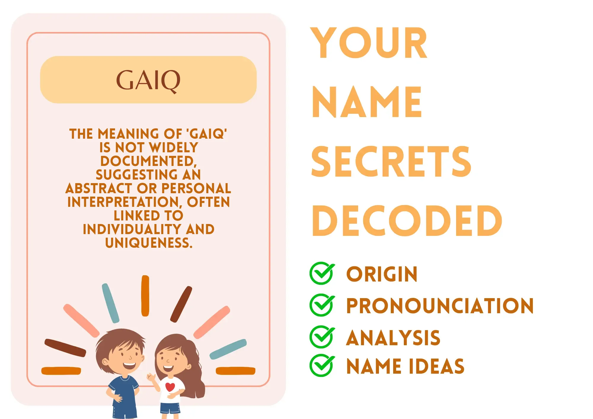 Meaning: The meaning of 'Gaiq' is not widely documented, suggesting an abstract or personal interpretation, often linked to individuality and uniqueness.