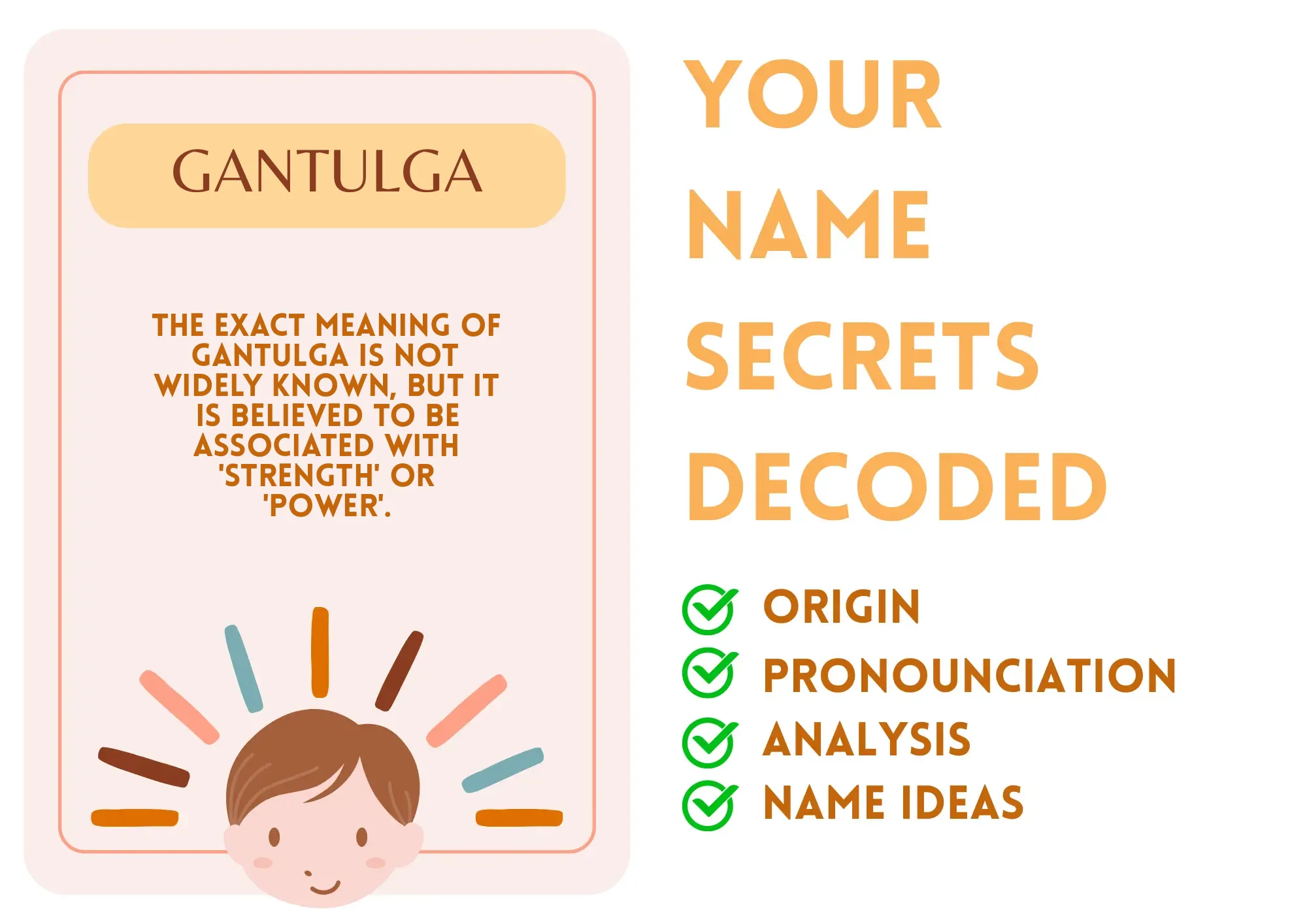 Imagine having a name that stands tall and proud, as strong as a mountain, yet as unique as a rare gem. That’s Gantulga for you! It’s not just a name; it’s a badge of honor. When you hear 'Gantulga,' you think of a person who embodies resilience and strength, like a superhero hiding in plain sight, ready to take on the world!