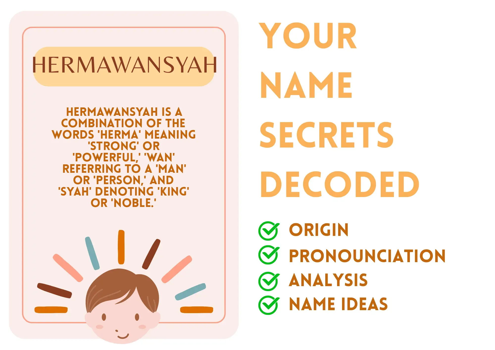 Meaning: Hermawansyah is a combination of the words 'herma' meaning 'strong' or 'powerful,' 'wan' referring to a 'man' or 'person,' and 'syah' denoting 'king' or 'noble.'