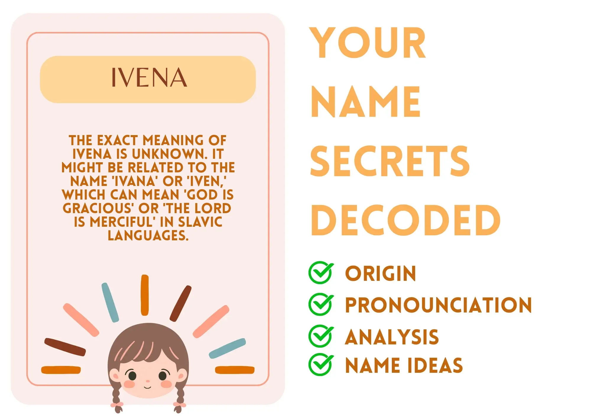 Ivena radiates warmth. Her name suggests a kind-hearted nature, much like a comforting hug on a chilly day. Though not everyone knows the specifics, it echoes principles like grace and mercy. Imagine Ivena as the friend who instinctively knows when you’re having a tough day, always ready with a listening ear or a cup of hot chocolate. She approaches life with empathy and a genuine desire to uplift others. Whether it's helping a pal in need or volunteering, her actions exemplify kindness, making her a beacon for those who cross her path.