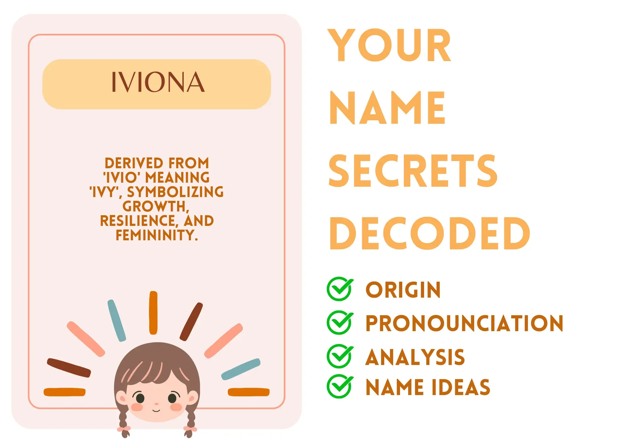 Derived from the Latin word 'ivio,' meaning 'ivy,' Iviona symbolizes growth, resilience, and femininity. Imagine ivy flourishing against a brick wall, despite harsh conditions—this is Iviona in action. Whether tackling school projects or overcoming personal challenges, you embody perseverance. When faced with obstacles, you don’t just bounce back; you climb higher, infusing those around you with encouragement and inspiration.