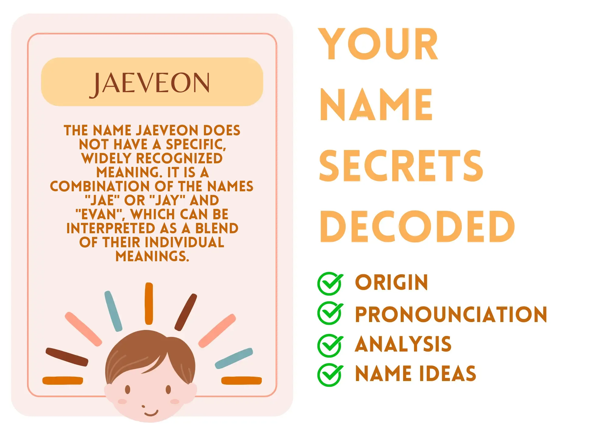 Jaeveon is a modern and distinctive name of American origin, primarily used for boys. It is a unique combination of the name "Jae" or "Jay" and the name "Evan", resulting in a strong and stylish sound. While the name lacks a specific, widely recognized meaning, it is often associated with qualities like strength, confidence, and individuality.