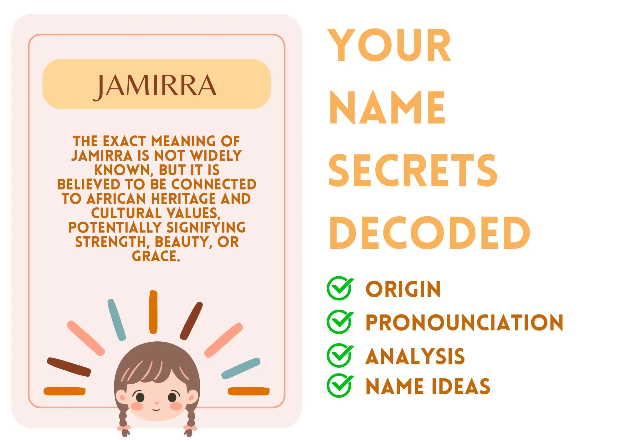 Meaning: The exact meaning of Jamirra is not widely known, but it is believed to be connected to African heritage and cultural values, potentially signifying strength, beauty, or grace.